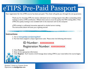 For businesses and employers who wish to pay for their staff, we now offer the eTIPS Pre-Paid Passports. Passports offer establishments, corporations, and organizations the flexibility of pre-ordering eTIPS registrations. For every passport that you purchase, our system will place a unique "PASSPORT NUMBER" for each student into your portal.